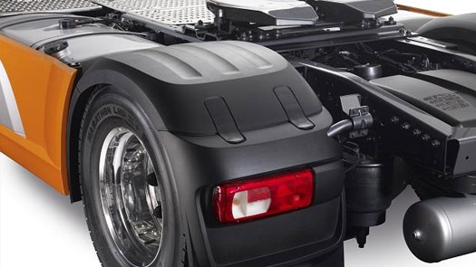 سیستم تعلیق عقب کامیون از نوع Stabilink است که باعث میشود ثبات و هندلینگ بسیار بالا برود. ظرفیت باک های این کامیون در مجموع 1,500 لیتر است که وقتی در کنار پمپ بنزین، مخازن هیدرولیک و جعبه ابزارها قرار بگیرد، فضایی معادل 3.80 متر را اشغال میکنند. به منظور فراهم کردن این فضا برای باک ها، باتری ها در انتهای شاسی قرار گرفتهاند. یک محفظه بار 0.09 متر مکعبی به نام AdBlue tank نیز به صورت استاندارد در زیر کابین تعبیه شده است که برای راحتی بیشتر، از پشت کابین میتوان به آن دسترسی داشت. محفظه مخصوص تایر زاپاس با محفظه باتری ادغام شده است تا فضای کمتری اشغال کند و به پایین آوردن وزن کل کامیون کمک کند. بادشکن بالای سقف و باله های جانبی به کاهش مصرف سوخت کمک زیادی میکنند و به این ترتیب، تولید گاز آلاینده CO2 را 10 درصد کاهش میدهند.